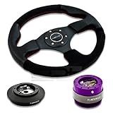NRG-SRK-121H+012R-S+200PP, NRG Innovations 12.5" 320mm Black Leather Red Stitch Suede Grip Racing Steering Wheel Combo with 6 Hole Short Hub Adapter with Gen 2.0 Purple Quick Release Kit SRK-121HNRG Quick Release features many options that conventional ball-locking quick release system do not. It is specially engineered with raised sections to prevent the scratching and stretching of the hub while a self locking feature adds increased safety and functionality. Features racing styled for added style and look. Each unit is made from the highest quality aircraft grade aluminum and is anodized for maximum durability and finish.