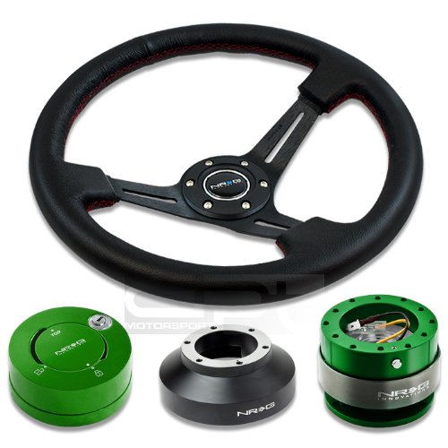 NRG-SRK-131H+200GN+101GN+018R, NRG Innovations 13.78" 350mm 3" Deep Dish Style Black Leather Red Stitch Black Spokes Racing Steering Wheel Combo with 6 Hole Short Hub Adapter with Gen 2.0 Green Quick Release with Green Lock Hub Kit SRK-131H